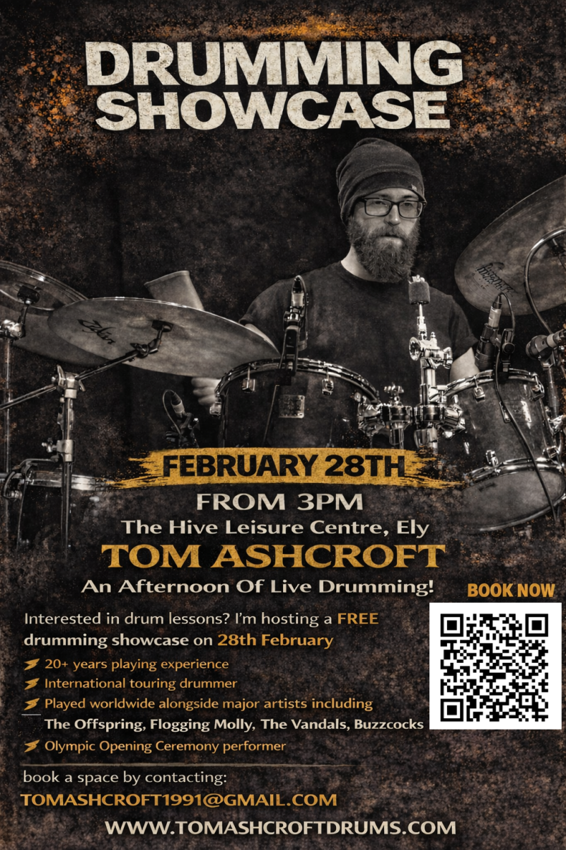 Discover an engaging introduction to drums on February 28th at The Hive in Ely! This free event is tailored for anyone eager to learn more about drumming. Spend an hour with me as I discuss drum techniques, showcase my skills by playing along to songs, and provide insights into my teaching approach.